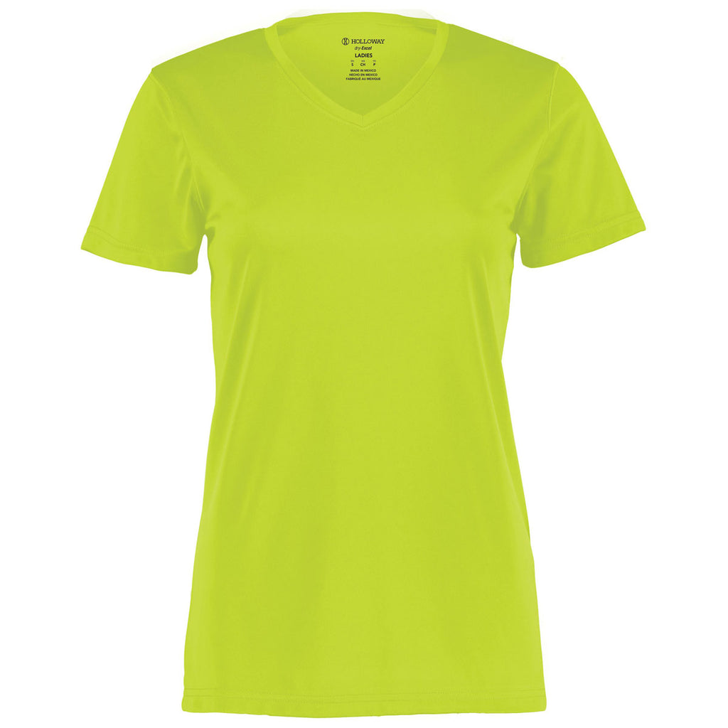 Custom screen print will pop on the Holloway Women's Lime Momentum Tee. This simple, straightforward tee is a must have as daily comfort wear that can be dressed up or down as needed. A basic tee is a wardrobe staple that can serve many purposes. Add a company logo to use as part of a uniform or a custom design to show affiliation with a group, club, or team. The feminine fitting tee is color secure, wicks moisture, and is odor resistant with V-neck collar and set-in sleeves. The possibilities are endless with this tee, so place your order right away.Corresponding Men's Style:Holloway Men's Lime Momentum Tee