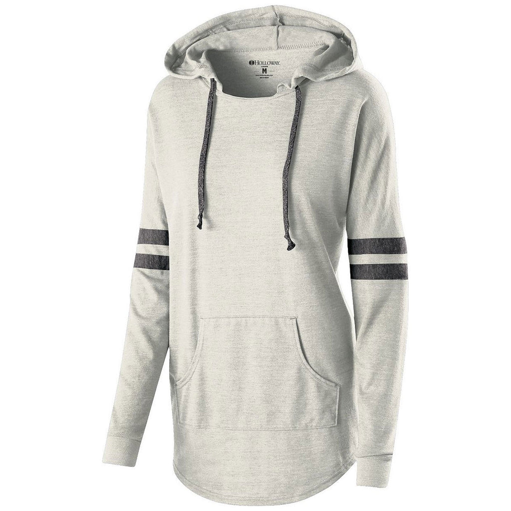 Holloway Women's Vintage Birch/Vintage Black Hooded Low Key Pullover with screen print design is ideal for days when you just want to be comfortable. The tri-blend vintage heather, long-sleeve pullover is lightweight in a feminine fit with a raw edge neckline which makes it a perfect employee gift. Raglan sleeves with contrast color sleeve stripes stand out with the longer length contoured bottom for coverage and comfort. Add a custom logo to this hoodie to add to your logoed apparel line with an all around hoodie that will be a fast hit. Place an order today to have these as soon as possible.Highlights