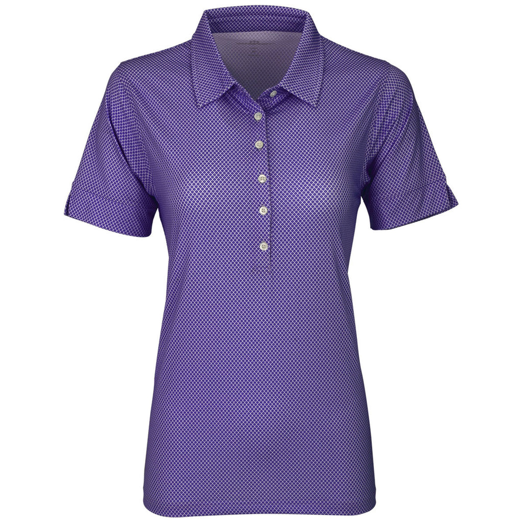 Design a custom embroidery for the Vansport Women's Purple/White Pro Eagle Polo to create an easy-to-wear look that is ready for the day. The short sleeve polo is lightweight, anti-microbial, and offers UV protection with an all-over diamond print. Hit the putting green, the back nine, or work in this versatile polo.Highlights