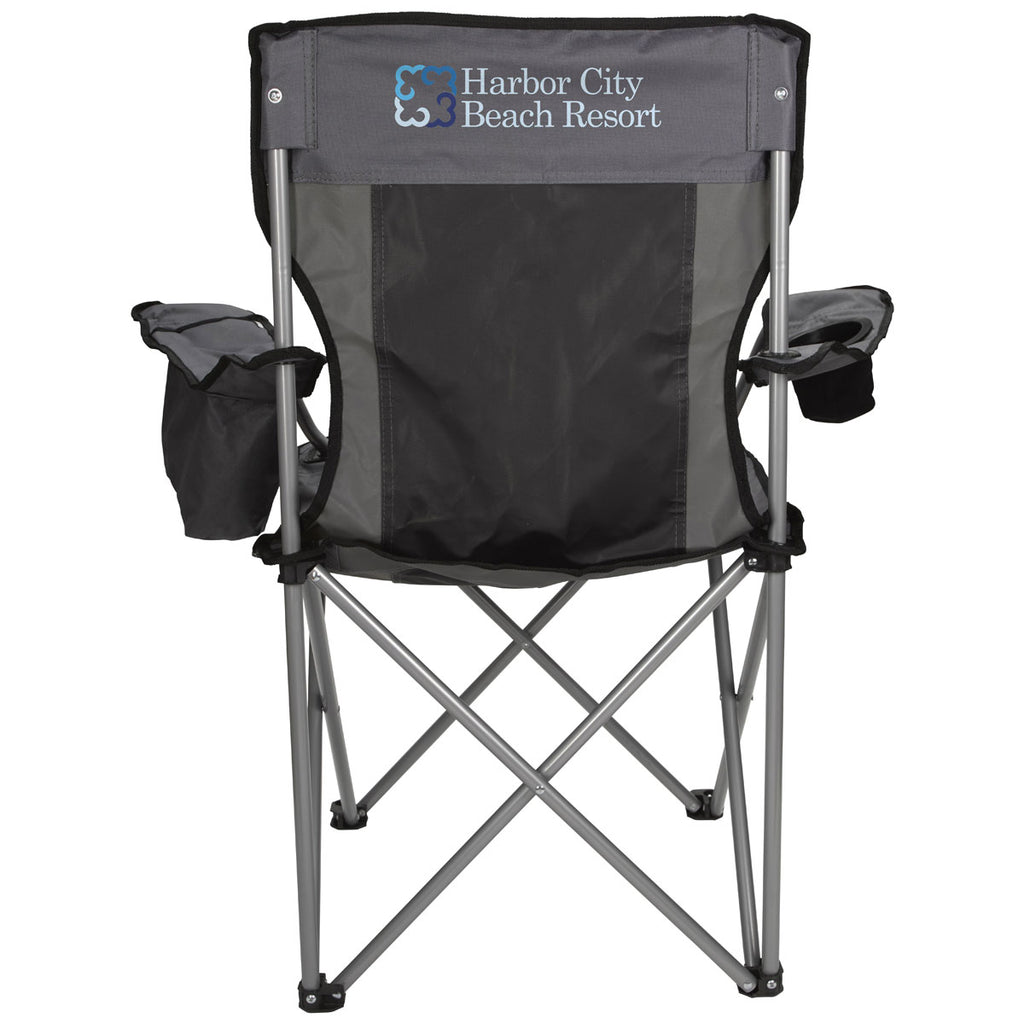 The Koozie Black Kamp Chair is a premium employee gift that everyone will find a use for. A great way to ensure your company's custom logo or design is highly visible at picnics, parks, and tailgates all over town, this chair comes with a soft-sided cooler into one of the armrests to keep your beverages crisp and cold.