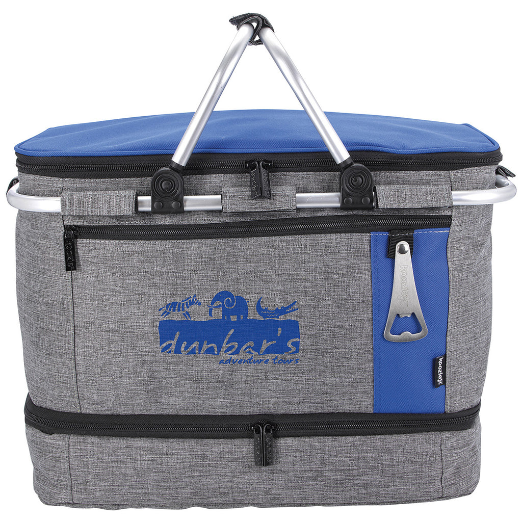 Design a logo for the Koozie Blue Collapsible Jumbo Picnic Basket to keep your picnic organized and ready to enjoy. This large, lightweight Koozie basket is perfect for tailgating, trips to the park, and travel. It comes with an attached bottle opener and zippered compartments for snacks or valuables. Order today to share with your customers.The minimum order for this product is 12 pieces.