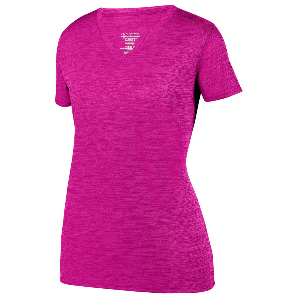 The custom logo Augusta Sportswear Women's Power Pink Shadow Tonal Heather Short-Sleeve Training T-Shirt is the perfect top to wear to yoga class, when out for a run or working out at the gym. With 12 vivid colors to choose from, there is bound to be the ideal color to match your gym apparel wear. Some of the features which will be appreciated with the short-sleeve training t-shirt include the 100% polyester heathered wicking knit fabric, stylish fit, pad print label, self-fabric v-neck collar, and set-in sleeves, to name a few. Add a screen print company logo to the front of the shirt and it's a wonderful advertising item as well. This is a great gift to hand out at the office as employee apparel wear.Highlights