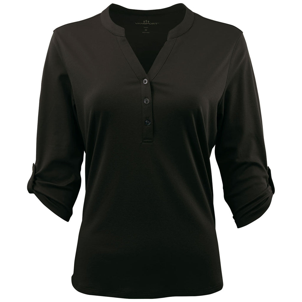 Keep things simple with a custom Vansport Women's Black Victory Polo. This moisture-wicking and anti-static polo is fitted with 3/5 length sleeve and a roll-up sleeve tab to create a unique look. The curved hem bottom offers a little extra coverage, whether hitting the driving range or heading to the office. A perfect canvas for your company logo.Corresponding Men's Style: Vansport Men's Black Victory Polo