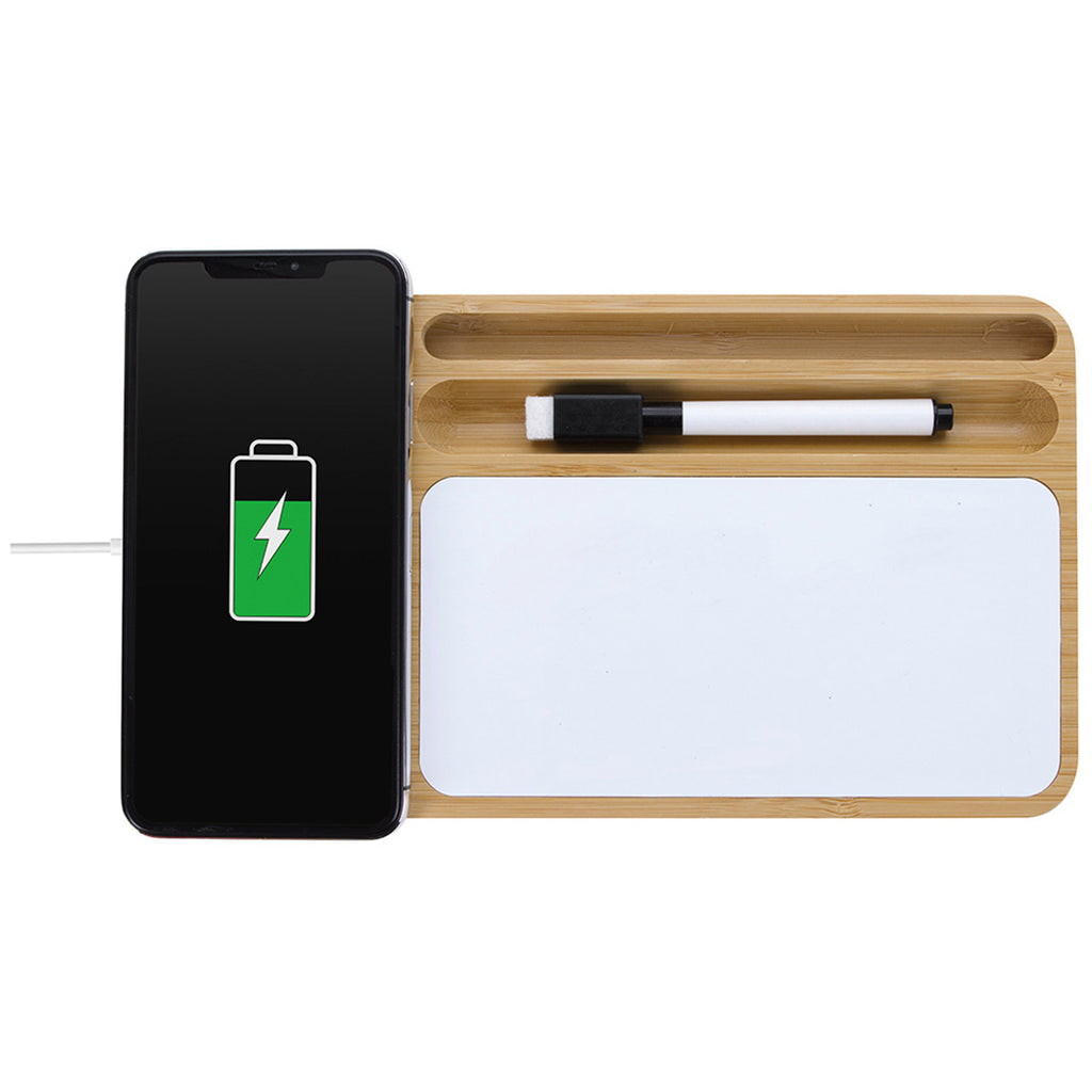 Stay organized with a custom logo Koozie group Natural Bamboo 10W Wireless Charging Base with Dry Erase Board. Thisis the perfect accessory for work, school, or home with a Qi enabled device charger, small compartments for items, and a built-in dry erase boards for messages. Give as gifts or sell in shops for others to share. Order today.The minimum order for this product is 25 pieces.