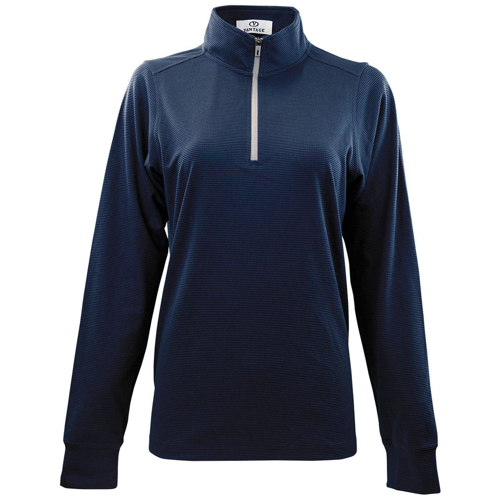 Vantage Women's True Navy Grid Quarter Zip Pullover with a corporate logo creates a simple and easy-to-wear top layer to keep your look professional yet comfortable. Ideal as part of a uniform for those working in the public or as a versatile addition to your personal wardrobe. The simple quarter-zip is comfortable for all-day wear. Place an order today.Corresponding Men's Style: Vantage Men's True Navy Grid Quarter Zip Pullover