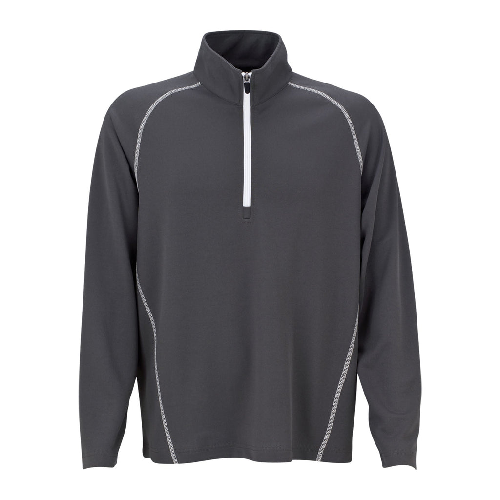 Vantage gives new meaning to the term high performance by introducing the company logoed Vantage Men's Dark Grey Performance Pullover. Designed with twill knit, the pullover contains highly durable polyester that enables the fabric to remain in pristine condition for years to come. The quarter-zip neck and contrast zipper complement triple-needle stitching to produce a chic corporate gift for your loyal customers. Wear the high performance pullover as an outer layer and as the middle layer between a Vantage tee and winter jacket. Add a custom logo on the large imprint area to wow customer prospects at business conferences.Highlights