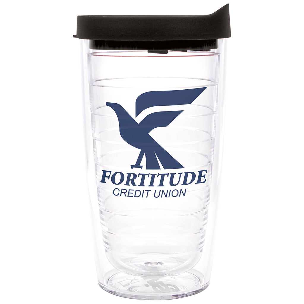 Tervis Clear Tumbler with Black Lid Classic Tumbler 16 oz. - Printed with a corporate logo is a fun and functional way to draw attention to your brand. Whether you are selling these tumblers, giving them away with purchase, or using them as an incentive for a recruiting event, they will be a fan favorite. Great for the morning commute or just to enjoy your favorite drink.The minimum order for this product is 24 pieces.