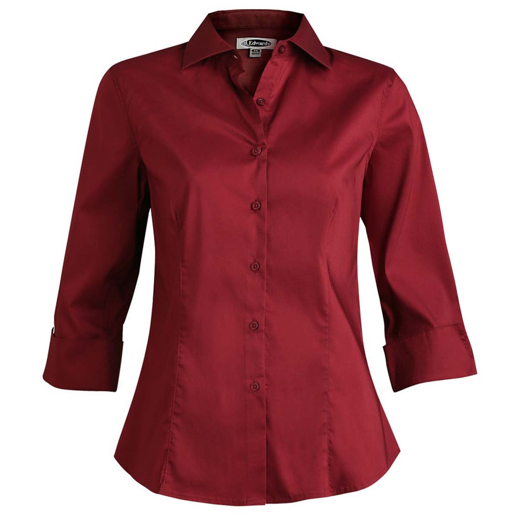 Create tailored corporate apparel for yourself or employees with a custom Edwards Women's Burgundy Tailored Full-Placket Stretch Shirt. Available in multiple colors, this cotton rich polyester and spandex blend provides a tailored fit that is great for daily wear. Add a corporate embroidery of your choice to truly showcase your company. Small extras like 3/4 sleeves with vents, French placket, and spread collar, make this shirt would be perfect for hospitality apparel as the face of your company. Place an order for several wrinkle resistant, machine washable shirts that will last for a long time both on and off the job.Highlights