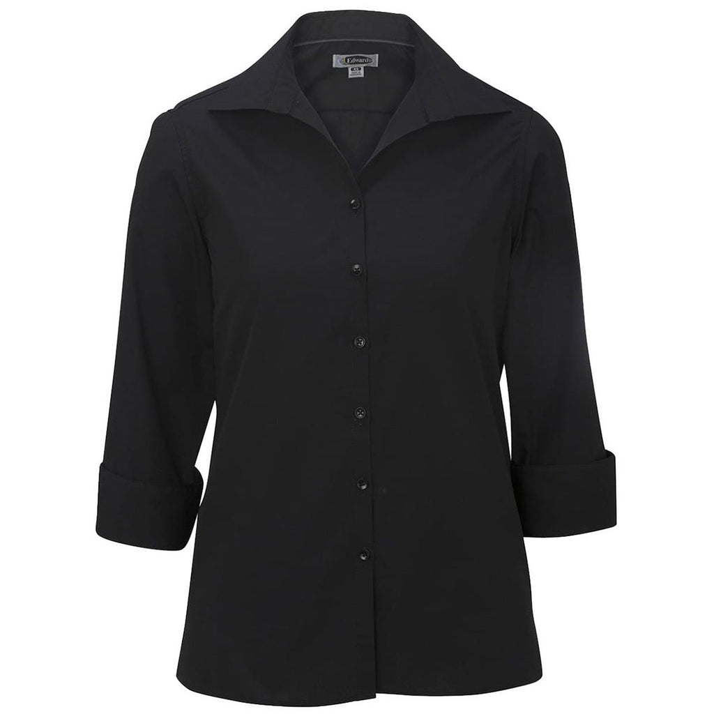 Your company logo will pop on the Edwards Women's Black Lightweight Poplin Shirt made of lightweight polyester and cotton. The 3/4 sleeve blouse has an open neck with contoured side seams and back darts making it fashionable enough to be used as corporate apparel. Machine washable and wrinkle resistant means all day wear of this shirt will still have you looking and feeling great. Try out a custom logo to use at special events or to show support for a specific organization. The simple button-up is stylish and easy to care for no matter what your day holds.
