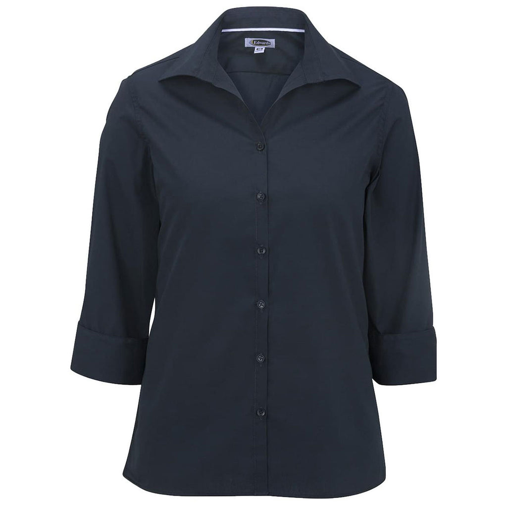 Your company logo will pop on the Edwards Women's Navy Lightweight Poplin Shirt made of lightweight polyester and cotton. The 3/4 sleeve blouse has an open neck with contoured side seams and back darts making it fashionable enough to be used as corporate apparel. Machine washable and wrinkle resistant means all day wear of this shirt will still have you looking and feeling great. Try out a custom logo to use at special events or to show support for a specific organization. The simple button-up is stylish and easy to care for no matter what your day holds.Highlights