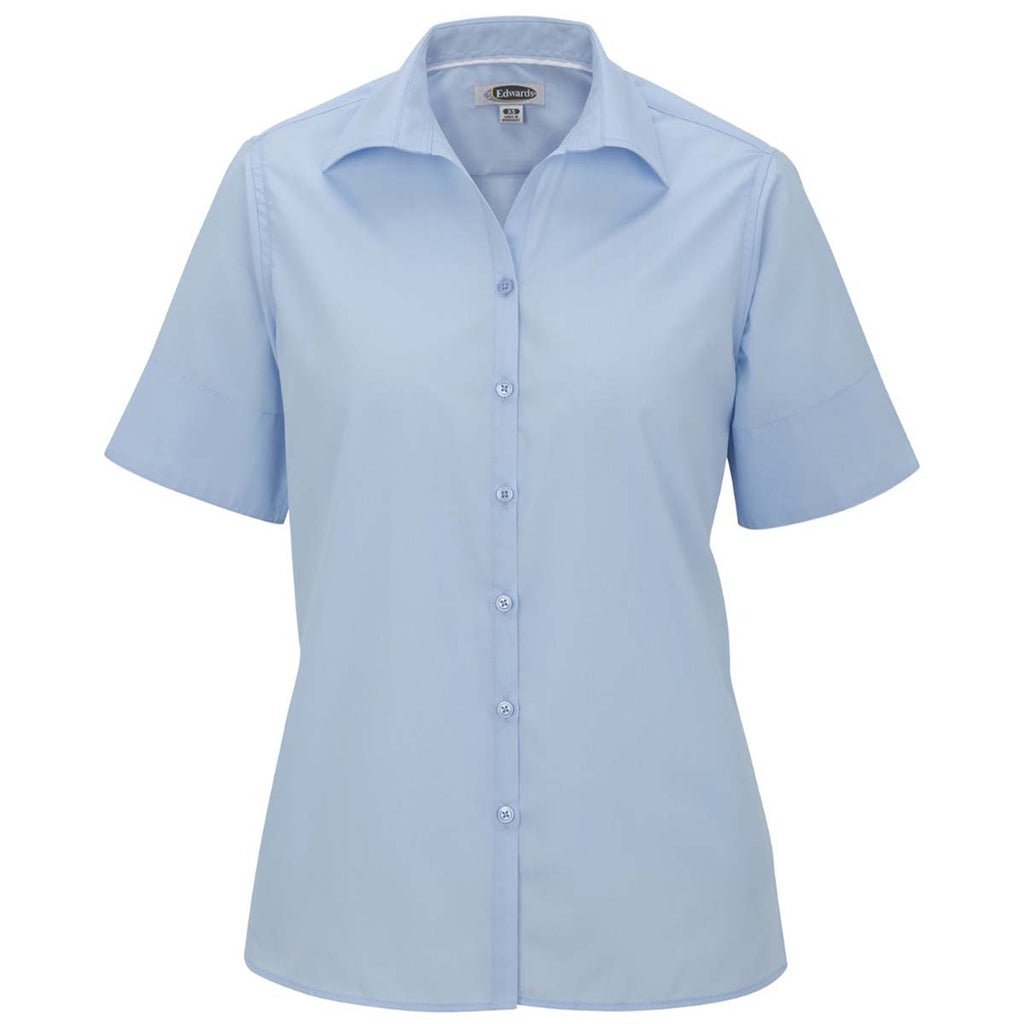 A custom dress shirt look with a comfortable feel comes together with the Edwards Women's Blue Lightweight Short Sleeve Poplin Blouse. Made to stand up to the demanding wear of customer service or restaurants, these make great employee apparel for those that work the hardest. Add a custom logo and choose the color you like best as hospitality apparel. Made of polyester and cotton, this short sleeve shirt with matching buttons, countered seams, and open neck this shirt can easily go from the office to the sales floor and anywhere in between. Choose the color and embroidery you like best and place an order.Highlights