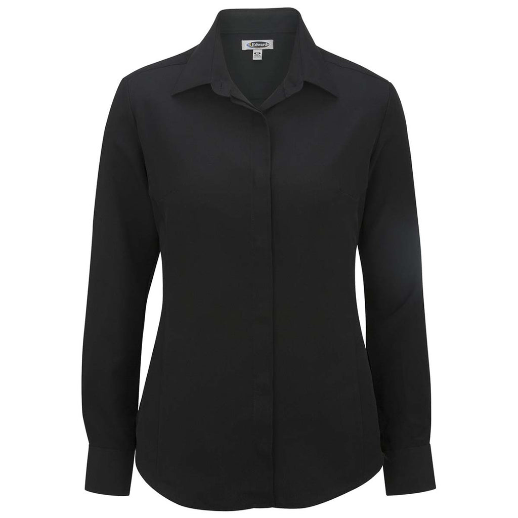 Create a custom updated look with the Edwards Women's Black Batiste Cafe Shirt in a range of classic colors. Offering a flattering fit in an understated style, this 100% polyester shirt is perfect for those who need employee apparel that demonstrates professionalism. Add a corporate embroidery to the long sleeve button up with two button adjustable cuff and narrow collar with hidden placket. Ideal for layering with a suit jacket as part of corporate uniforms the shirt is wrinkle resistant, offers soil release, and moisture wicking. Your custom logo will look beautiful on these shirts that offer the ability to be paired with jeans, slacks, or almost any type of attire you can imagine.Highlights