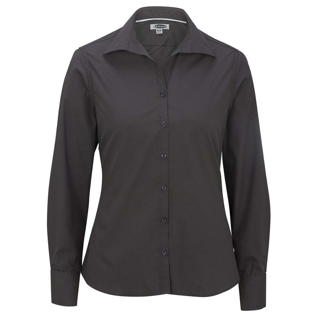 A custom dress shirt look with a comfortable feel comes together with the Edwards Women's Steel Grey Lightweight Open Neck Poplin Blouse. Made to stand up to the demanding wear of customer service or restaurants, these make great employee apparel for those that work the hardest. Add a custom logo and choose the color you like best as hospitality apparel. Made of polyester and cotton, this long sleeve shirt with matching buttons, countered seams, and open neck this shirt can easily go from the office to the sales floor and anywhere in between. Choose the color and embroidery you like best and place an order.