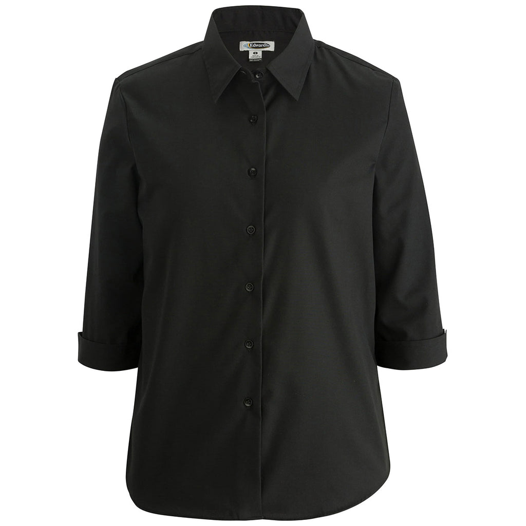 Up your uniform game with the embroidered Edwards Women's Black Essential Broadcloth Blouse. This lightweight polyester rich cotton blend has an improved fit that makes it ideal as employee apparel with a company logo. The performance broadcloth shirt is made for comfort with a point collar with permanent stays, 3/4 sleeve with adjustable cuff, and straight back yoke seam. Wrinkle resistant, this button up will keep you looking and feeling great whether serving customers or leading a meeting. Wear alone or pair with a jacket to create a custom look.