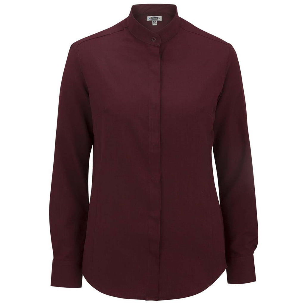 Enjoy all day custom comfort with the Edwards Women's Burgundy Batiste Banded Collar Shirt with contemporary pattern accents on a soft, supple polyester fabric. The ideal choice for hospitality apparel for those working in resorts, hotels, or restaurants, this long sleeve dress shirt has a covered placket with unique banded collar that creates a flattering silhouette. Easy to laundry these shirts are wrinkle resistant, moisture wicking, and offer soil release in an easily embroidered material. Add your corporate embroidery or custom logo to improve employee visibility even at large events.Highlights