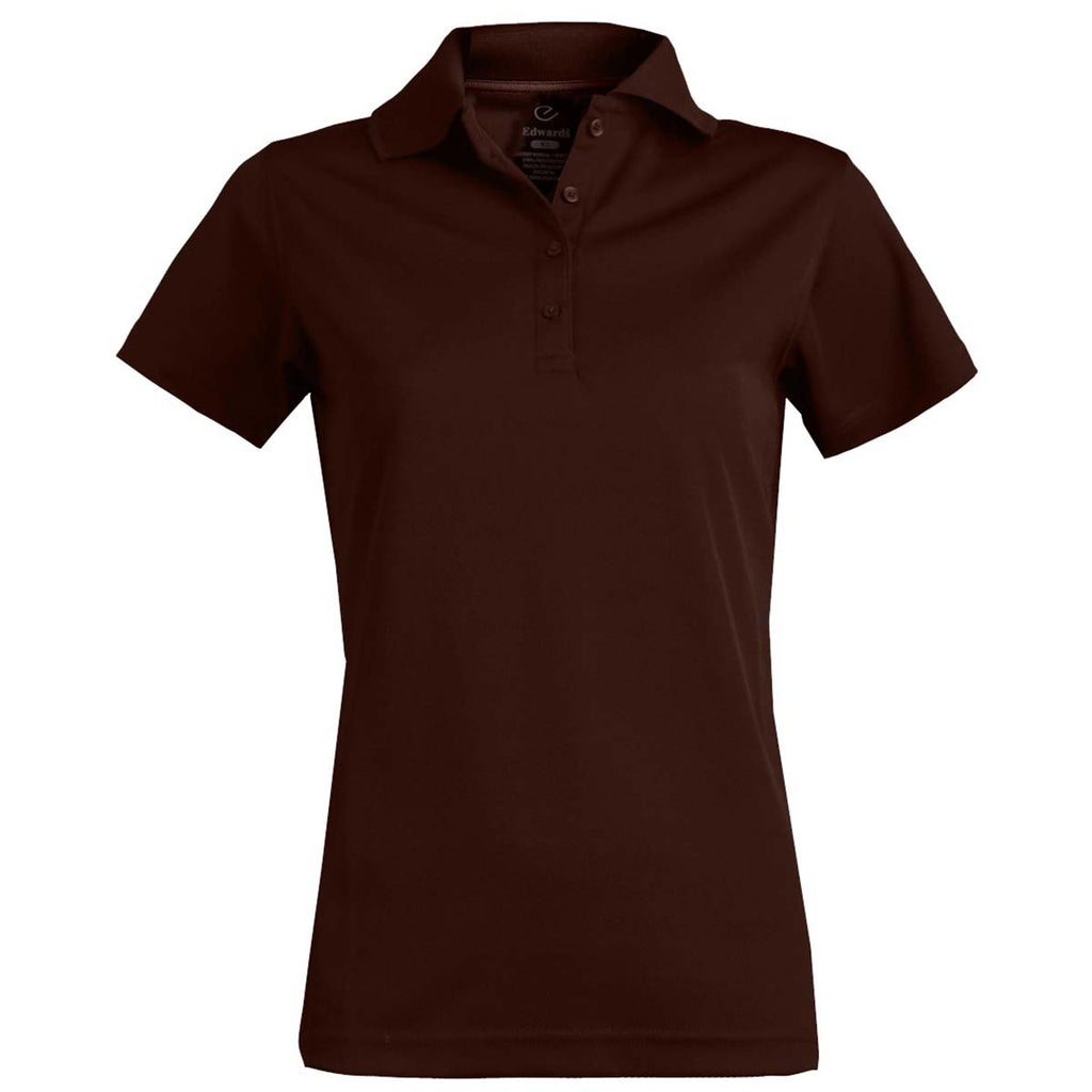 Hit the back nine in this custom Edwards Women's Espresso Hi-Performance Mesh Short Sleeve Polo. Made from 100% polyester, this short sleeve mesh weave polo with feminine silhouette wicks moisture from your body when you are working hard. Ideal as employee apparel or even corporate uniforms for those who need them, these polos will carry your corporate embroidery with style and pride. The lightweight fabric offers an antimicrobial shield and soil release so you can always look your best, even when working outdoors. The snag, fade, shrink, and wrinkle resistant fabric can be machine laundered for easy care and to have available for new employees.Highlights