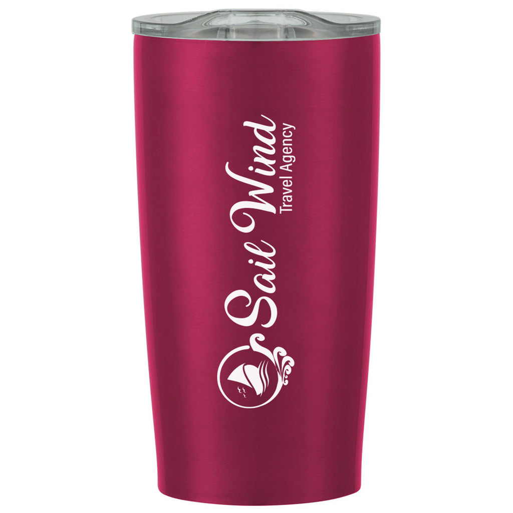 Hit Metallic Fuchsia with Clear Lid 20 Oz. Himalayan Tumbler with a custom logo makes your morning commute and afternoon drink a bit easier to enjoy. The stainless steel tumbler has double wall construction and keeps drinks hot or cool for up to 6 hours as needed. Choose the color you prefer to create a personalized item for your company or event.
