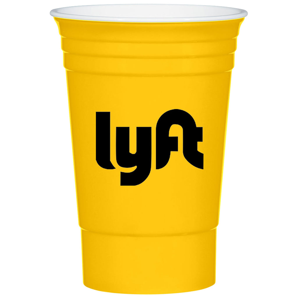Hit Yellow/White The Cup with a custom logo will keep your party going. This silkscreen custom cup is perfect for big events like receptions, family reunions, or tailgating, so everyone knows the host or sponsor. The large 16-ounce size is sturdy, reusable, and available in various color options. Serve your signature drink, or let people choose their own to keep the fun going.