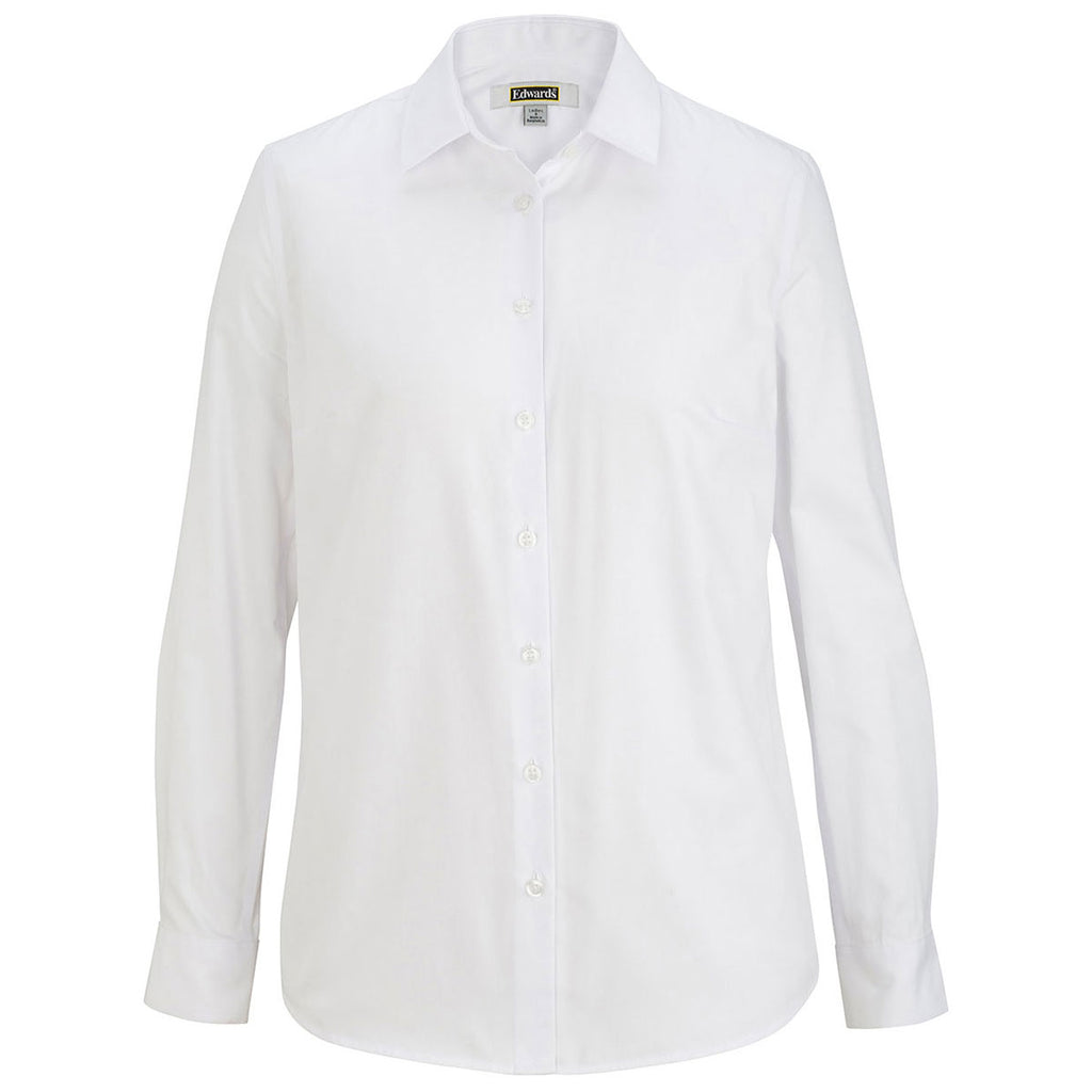 Choose your embroidery for the Edwards Women's White Pinpoint Oxford to enjoy a lightweight professional look that will turn heads. The tailored fitting oxford offers light stripes for an eye-pleasing look. Add a company logo to use as corporate apparel or as employee apparel that will have employees looking polished and professional. The wrinkle free fabric looks great even when your hours are long and the spread collar has permanent stays to maintain appearances. Princess back seams and a curved hem on the machine washable oxford gives this long sleeve shirt a feminine flair that can be worn alone or paired with a sweater or blazar.Highlights