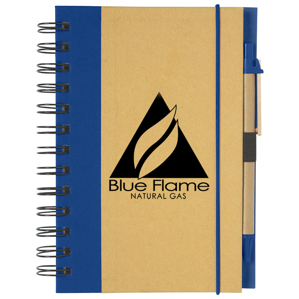 Choose your corporate design or logo for the Hit Natural/Blue Eco-Inspired Spiral Notebook & Pen to give to new hires, share at meetings, or give away at networking events. The 80-page lined notebook has a matching pen with a paper barrel held in an elastic pen loop for organization. The cardboard cover is held closed with a band closure.