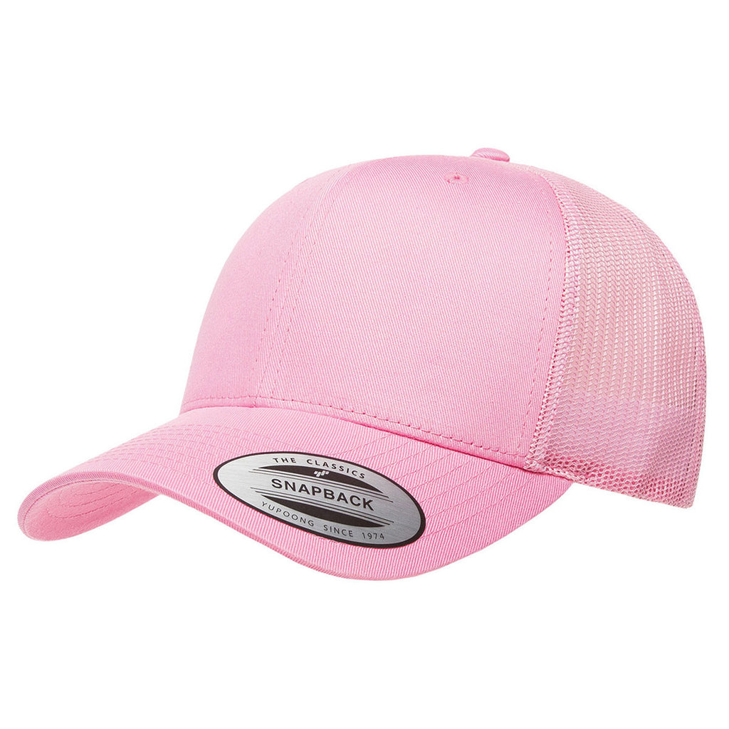 You don't have to give the Yupoong Pink Adult Retro Trucker Cap to actual truckers. With your company's custom logo on the bill, this premium hat will be valued and worn by any man. Just think what a great item this would be to hand out at trade shows! It has a six panel construction with eight row stitching on the flat visor. It has hard buckram backed front panels, 3 1/2" crown, and matching undervisor. A sure fit is ensured with an adjustable plastic closure. This trucker cap is available in 11 colors. Five are solids like black, red, and pink. The remainder are two-color combinations such as brown and khaki, and navy and white.Highlights