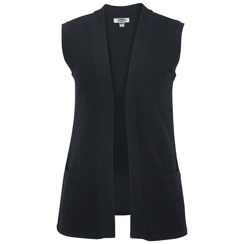 Create a custom look that will be envied with the Edwards Women's Navy Open Cardigan Sweater Vest. Made of a cotton rich, acrylic, and nylon blend in a fine gauge lightweight sleeveless vest style. The lower welt pockets in the front with a tubular bottom hem creates a look that works as employee apparel or as part of hospitality apparel for those who interact with customers daily. Your corporate embroidery will stand out on the flattering silhouette that can be used at home or the office with ease.Highlights