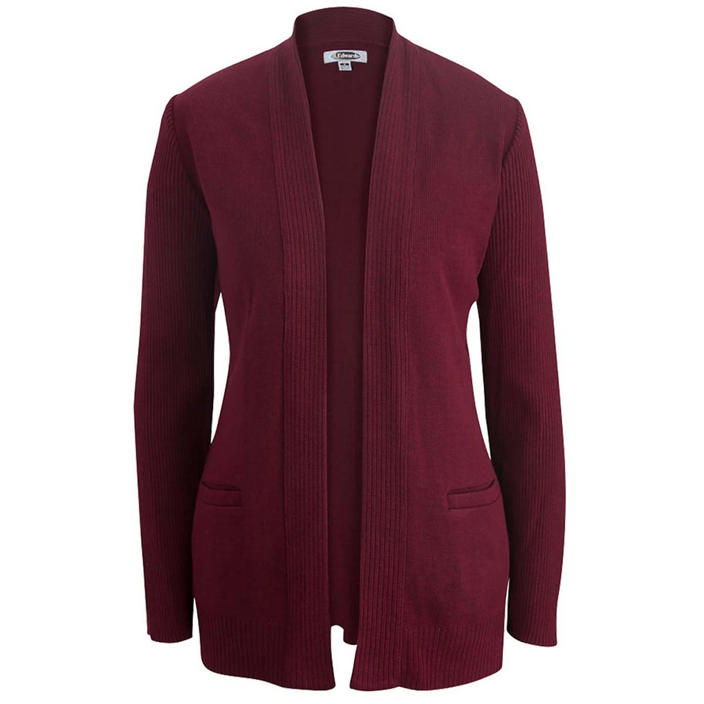 Create a custom look that will be envied with the Edwards Women's Burgundy Open Acrylic Cardigan. Made of 100% acrylic in a hip length traditional look. The open style with button free front, ribbed bottom, and welt pockets create a look that works as employee apparel or as part of hospitality apparel for those who interact with customers daily. Your corporate embroidery will stand out on the durable, high performance cardigan that can be used at home or the office with ease.Highlights