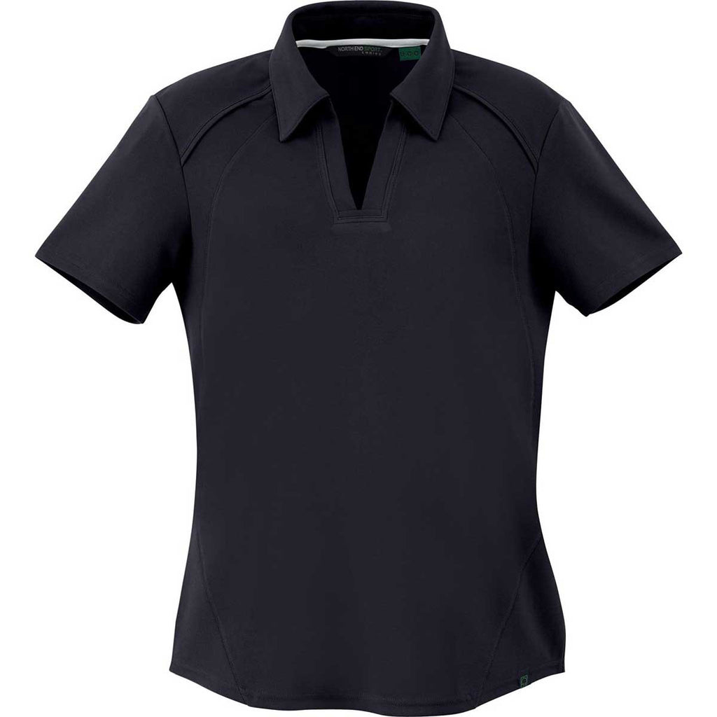 Self-fabric flat piping located along the front yoke seams enhances the style of the North End Women's Black Performance Pique Polo. More than one-half of this polo contains to make a strong eco-friendly fashion statement. Forty-six percent yarn wicking polyester pique ensures you enjoy the polo as often as you like. Moisture wicking technology keeps you cool under pressure, while ultraviolet protection ensures your skin remains healthy. Add a custom logo to the large chest area for promoting your company at civic events. The North End Women's Black Performance Pique Polo provides fashion versatility.Corresponding Men's Style: North End Men's Black Recycled Polyester Performance Pique Polo