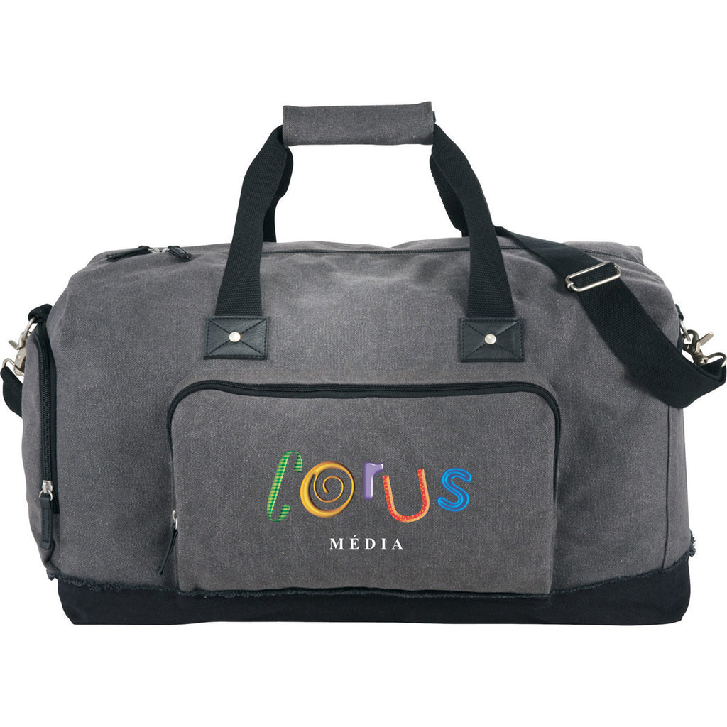 Instead of waiting in long airport luggage check in lines, buy the Field & Co. Grey Hudson 21" Weekender Duffel Bag to head straight for the concourse. Rugged vinyl and super soft cotton combine to produce a durable duffel bag that handles any punishment dished out to it. Take the duffel bag on a weekend camping trip and to the gym for your daily workouts. The dedicated shoe compartment allows you to pack an extra pair of dress shoes for business trips. Use the exterior slash pockets for gaining quick access to your electronic devices. Attach your corporate logo to promote your company inside of crowded airports.