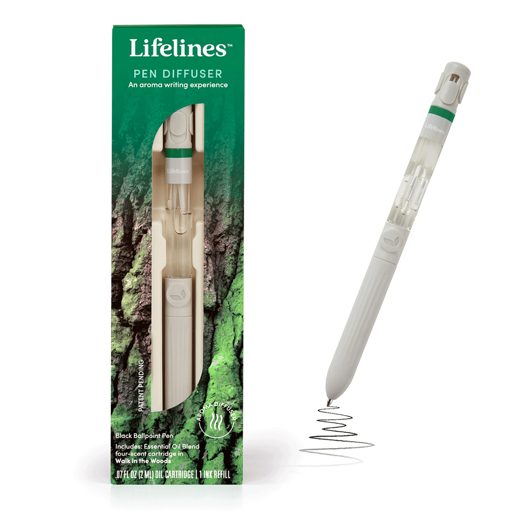 The Lifelines Pen Diffuser with 4-Scent Cartridge in Walk In The Woods transforms your writing into a beautiful sensory experience by diffusing aroma as you go. Pen contains 4 Essential Oil Blends from the Walk in the Woods collection, verdant forests and velvety moss underfoot, inspiring four well-being goals: calm, focus, energy, and joy. Simply lower the tabs to diffuse scent—or shut them to use as a regular pen!