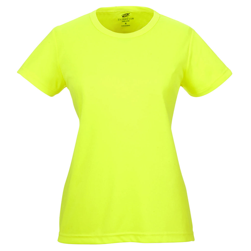 Snag-resistant 100% micro-polyester ensures the UltraClub Women's Bright Yellow Cool & Dry Sport Performance Interlock T-Shirt never succumbs to the punishment inflicted by intense athletic competitions. The rip and tear resistant interlock t-shirt contains moisture wicking technology that rapidly absorbs and evaporates sweat to cool the body. Ultraviolent ray protection prevents the sun from causing permanent damage to vulnerable skin tissue. Open cuffs and double-needle sleeves create a visually appealing appearance that professional peers notice at corporate events. Take advantage of the attention by adding your company logo to the large imprint area. Logoed corporate apparel makes the ultimate gifts to reward your team of high achievers.Corresponding Men's Style: UltraClub Men's Bright Yellow Cool & Dry Sport Performance Interlock T-Shirt