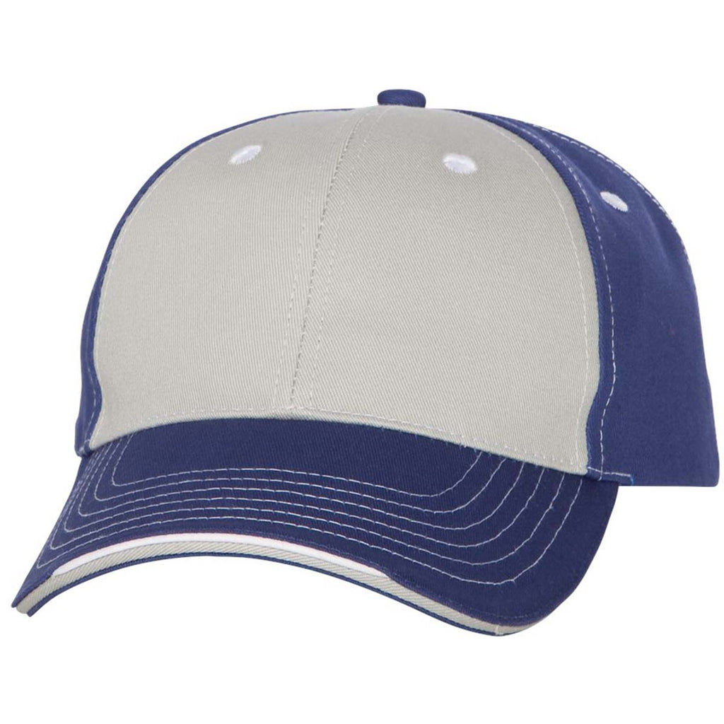 Get creative with your employee apparel by adding a custom Sportsman Grey/Royal Tri-Color Cap in a variety of color combinations. Made of 100% cotton and Chino twill this is a must have cap due to its unique look. Add a corporate embroidery to the structured, six panel, mid-profile cap as a form of advertising or as gifts. The pre-curved accent stitch layered sandwich visor offers a hook and loop closure for easy fitting. This will be the headwear everyone wants after you add a custom embroidery of your choosing. Place your order today to be prepared for whatever cap needs you may have.Highlights