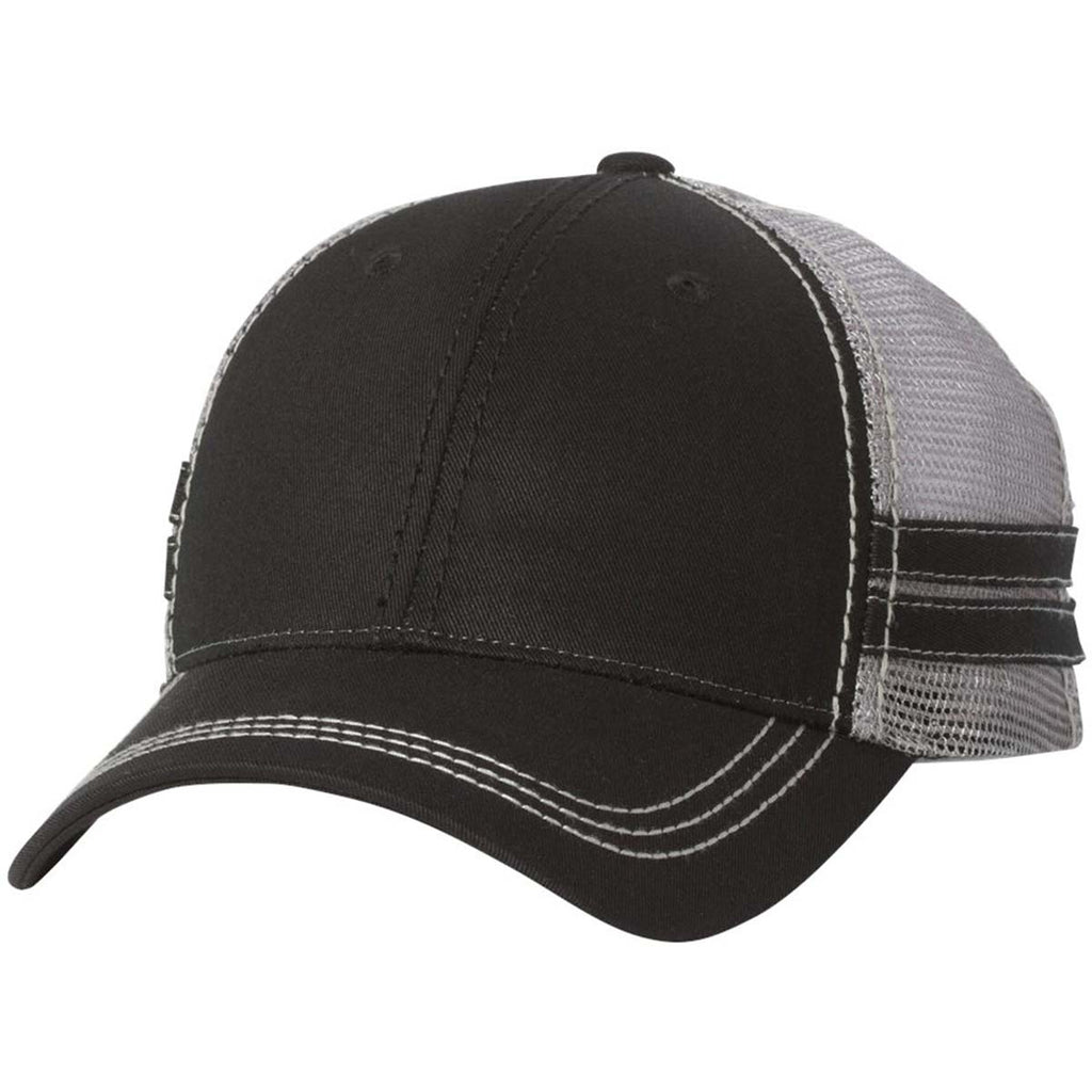 Create a custom classic with the Sportsman Black/Grey Trucker Cap with Stripes in a large variety of color combinations. Made of cotton and chino twill front with a polyester mesh back with color corresponding double stripe, this trucker cap will be an instant favorite for most. The structured, six-panel, mid-profile fit has a pre-curved stitch visor and sewn eyelets for the true trucker cap look. Add a custom embroidery to have custom headwear people will want or a company logo to use this as part of employee apparel. The snapback closure means adjusting the size of this cap is a breeze.Highlights