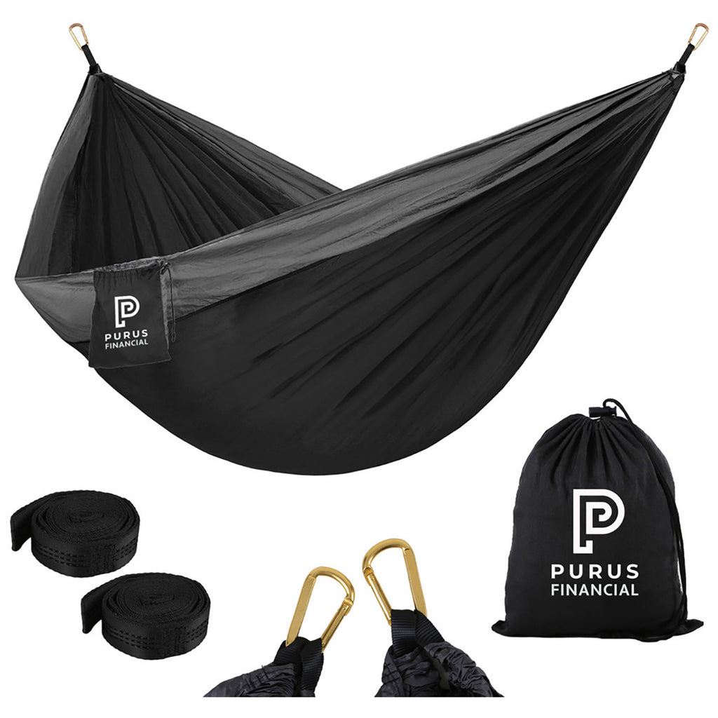Origaudio Black The Hangout Portable Hammock with a custom logo is an adventure-ready essential for relaxation. The durable hammock comes with setup hardware for tree suspension. Grab the convenient carrying bag and take this hammock on a day hike, camping, or to relax after the hunt. Perfect as an addition to hunting and camping stores. Order today.The minimum order for this product is 1 piece.
