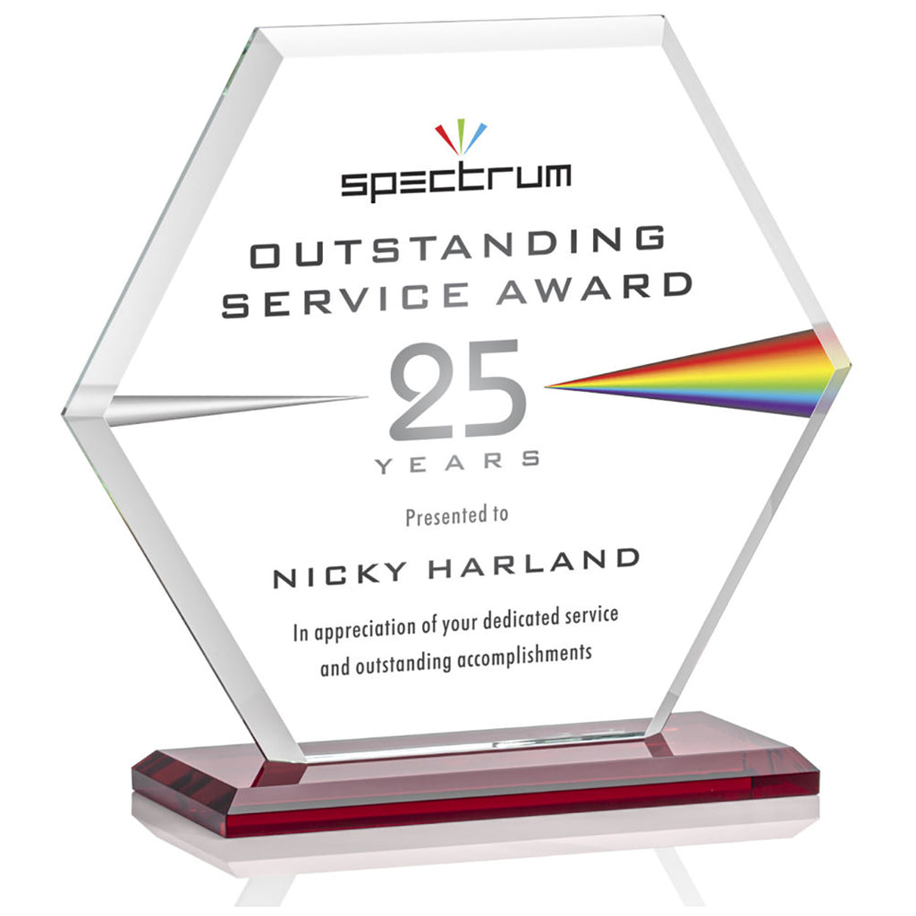 St. Regis Red Barnett Award 8" x 8.25" x 3" - Printed with a custom message comes in multiple sizes to fit your special awards ceremony needs. The beveled Starfire Crystal hexagon is mounted on your choice of bases. Perfect to recognize outstanding service, anniversaries, or anything you choose. Order before your next event.The minimum order for this product is 1 piece.