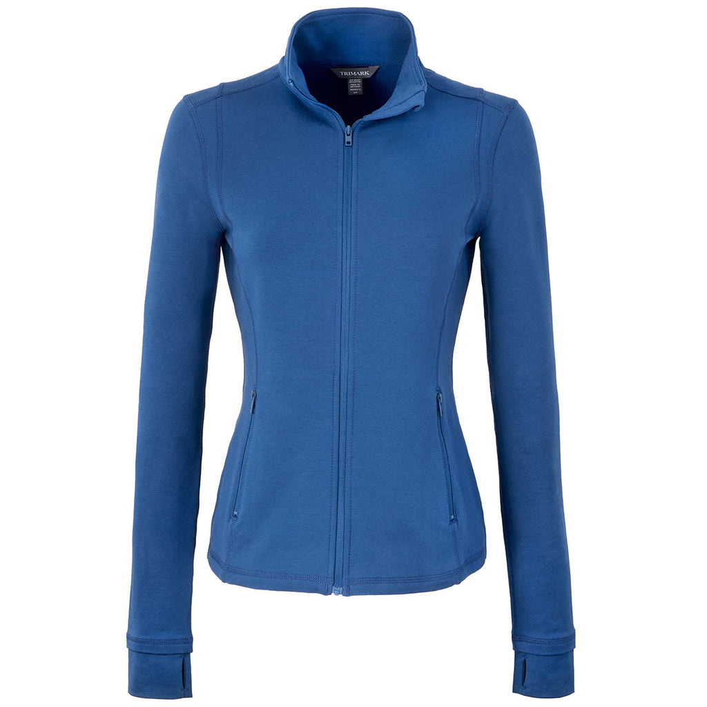 Add an embroidered logo to the Elevate Women's River Blue Lyon Eco Stretch Knit Full Zip Jacket to enjoy an active lifestyle look that is ready for adventure. Whether you are heading to yoga, going for a run, or hanging with friends, this jacket with thumb holes is a must-have for comfort and convenience. With breathability and stretch from spandex, you can have fun while looking great.