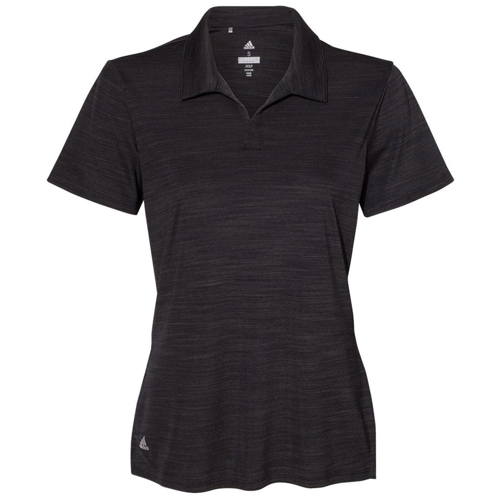 Make a custom statement with the Adidas Women's Black Melange Sport Polo in a range of colors and sizes. Created from 100% recycled polyester with striated heather interlock, this polo is a must have for both home and office. Add a custom logo to use as employee apparel that will look good and be easy to wear during long work hours. A self collar with fashion V-neck placket adds a bit of style to the polo design and the contrast Adidas logo on the right hip screams quality. A corporate embroidery allows this to be an option for corporate apparel whether paired with a jacket or worn alone as a statement piece.