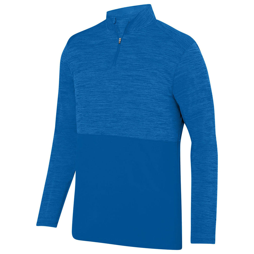 The custom Augusta Sportswear Men's Royal Shadow Tonal Heather Quarter-Zip Pullover offers a creative take on the highly-applauded pullover style top. Offering dual-design features, the top of this pullover is comprised of a 100% polyester heathered wicking knit material, including the collar and sleeves, while the bottom portion of the shirt is a solid 100% polyester wicking knit fabric. Other features you'll find with the men's quarter-zip pullover include a pad print label, self-fabric collar, and set-in sleeves. The pullover is available in nine trendy colors and can have your embroidery company logo added to it. This top makes a great employee apparel gift.Highlights