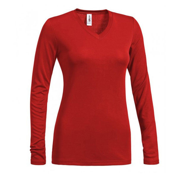 Expert Women's Red V-Neck Long Sleeve Tee is a superb summer activewear essential. Its classic v-cut neckline adds to cool athletic style and makes for superior breathability. It's breathable and super-comfortable and wicks away sweat cooling you down during cardio or Zumba, and its stretchiness allows you to easily move around. Crafted from 100% microfiber polyester pk maX. Suitable for any sport, this full-sleeve women's t-shirt is customizable with your company's logo for corporate branding or giveaway swag.The minimum order for this product is 12 pieces.
