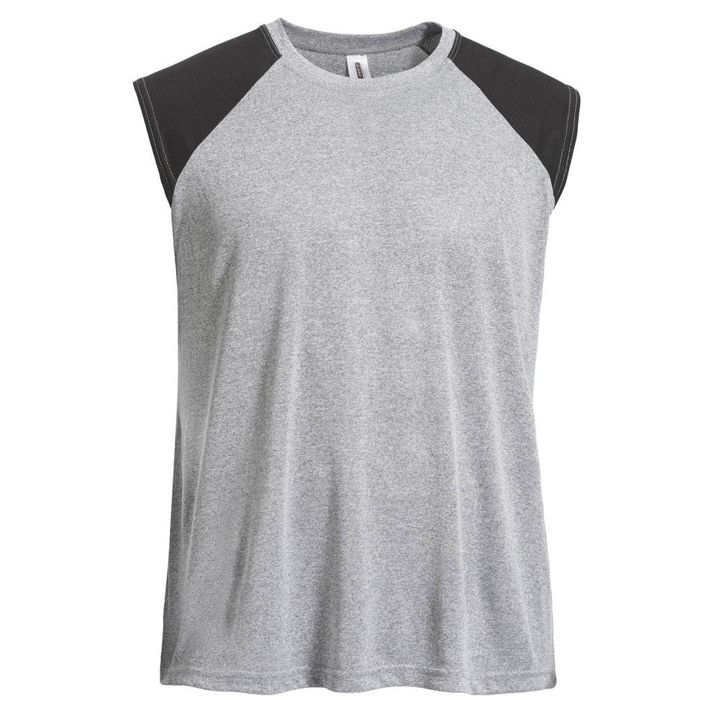 Turn heads without even making a move in this Expert Men's Heather Grey/Black Sleeveless Colorblock Natural Feel Training Tee. Contrast oXymesh shoulder panels lend it a preppy vibe while still maintaining its masculinity. It's made of cotton like microfiber poly jersey that with wicking properties that will deflect any sweat that develops as you workout. Treated with BodyFreshe antibacterial technology to ward of odor. A versatile option for companies looking for custom logo tees made with an active lifestyle in mind.The minimum order for this product is 12 pieces.