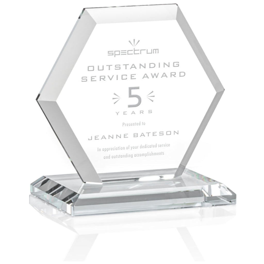 St. Regis Clear Barnett Award 4" x 4.25" x 3" - Laser Engraved with a custom message comes in multiple sizes to fit your special awards ceremony needs. The beveled Starfire Crystal hexagon is mounted on your choice of bases. Perfect to recognize outstanding service, anniversaries, or anything you choose. Order before your next event.The minimum order for this product is 1 piece.