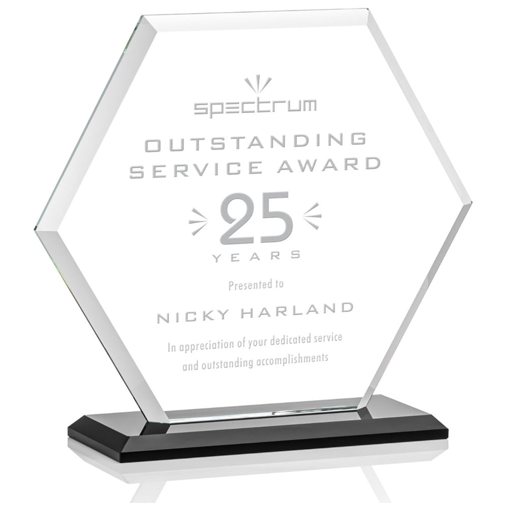 St. Regis Black Barnett Award 8" x 8.25" x 3" - Laser Engraved with a custom message comes in multiple sizes to fit your special awards ceremony needs. The beveled Starfire Crystal hexagon is mounted on your choice of bases. Perfect to recognize outstanding service, anniversaries, or anything you choose. Order before your next event.The minimum order for this product is 1 piece.