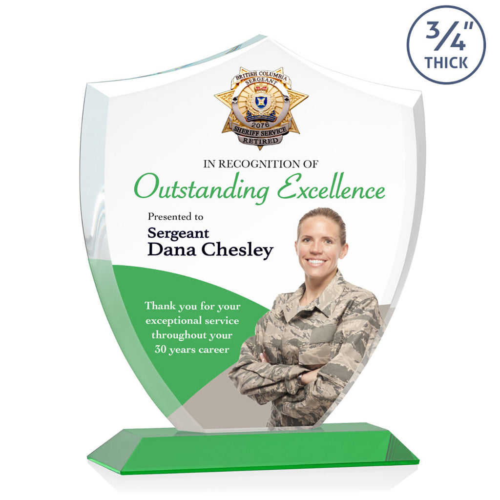 Choose your custom design for the St. Regis Green Scudo Shield Award 8.125" x 9.75" x 3" with Standard Base - Printed to show appreciation to those who show excellence daily. The shield design makes these ideal for first responders, law enforcement, and others who focus on protection, authority, and stability in the community. Order early so you do not miss out.The minimum order for this product is 1 piece.