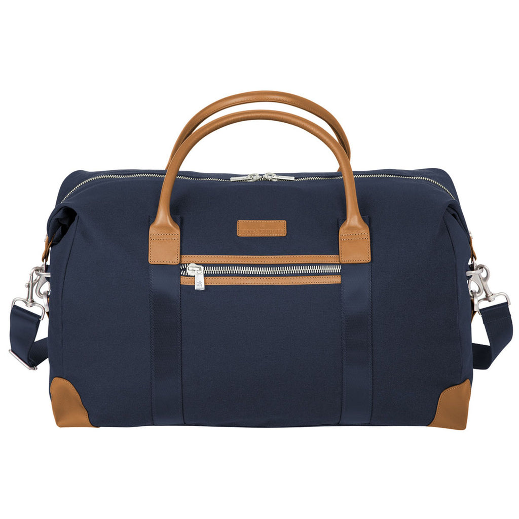 Brooks Brothers Navy Blazer Wells Duffel with a custom logo is the easiest and best way to prepare for weekend travel. The mid-sized duffle holds 42.3 liters of stuff with leather carry handles and a removable shoulder strap to use as needed. Use the metal zipper to open the large main compartment and pack with ease to prepare for wherever you may go. Place an order today.