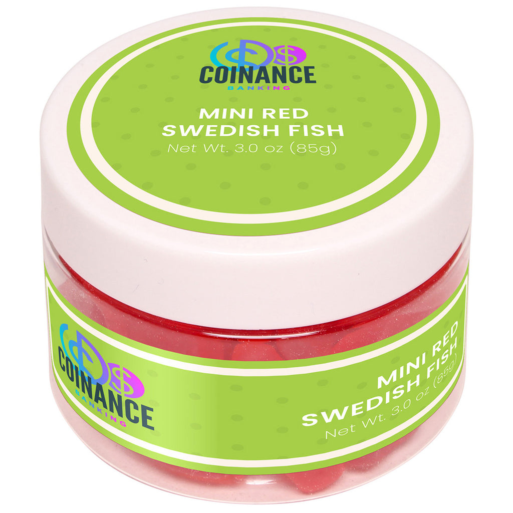 SugarSpot Clear Mini Red Swedish Fish: Small Jar with a custom logo will remind recipients of simpler times with the well-loved classic flavor. The fruity, fish-shaped gummies are nostalgic for so many that good memories will instantly attach. Great for trade shows and networking events to draw in a crowd, these can also be used as individual gifts. Order today.The minimum order for this product is 25 pieces.