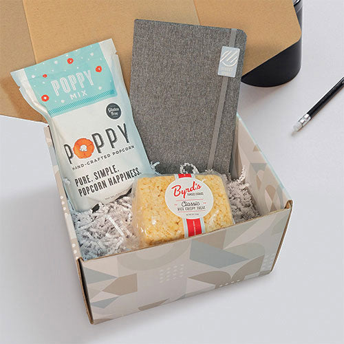 Treat your employees to an appreciation gift or welcome kit they'll love by presenting them with the Batch & Bodega White Hello, There Batch - Lite featuring your custom logo on the elegant gift box. Inside, they'll find an array of gourmet treats as well as a stylish bound journal.