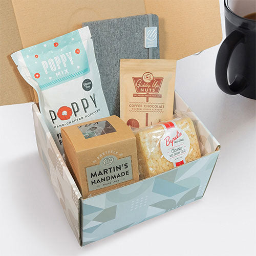 The Batch & Bodega White Hello, There Batch - Regular features a wide variety of sweet and savory snacks as well as a professional bound journal, all packaged within a contemporary gift box that can be personalized with your company's custom logo. It's a great appreciation gift for anyone working from home.