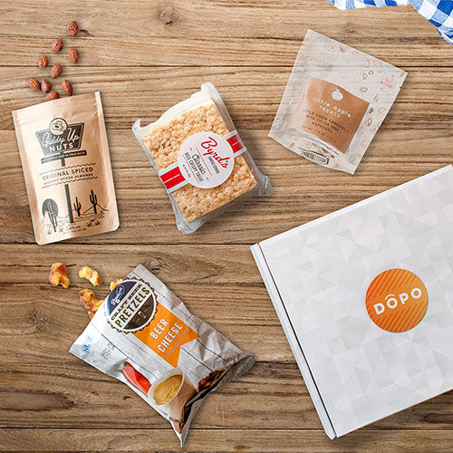 The Batch & Bodega White Hopscotch Batch - Lite contains both sweet and savory treats so that everyone can find something they're sure to love. Add your company's custom logo to the exterior of this stylish gift set for an employee appreciation gift that will satisfy all kinds of cravings.