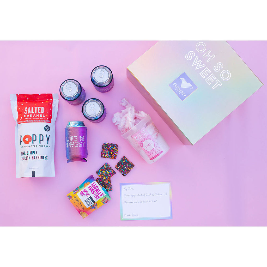 The Batch & Bodega Iridescent Sugar Rush Batch - Regular is a super-sweet way to surprise employees working remotely or celebrate important milestones around the office. Add your company's custom logo or design to this gift set, which includes sweet treats, gourmet goodies, and some fun party accessories.
