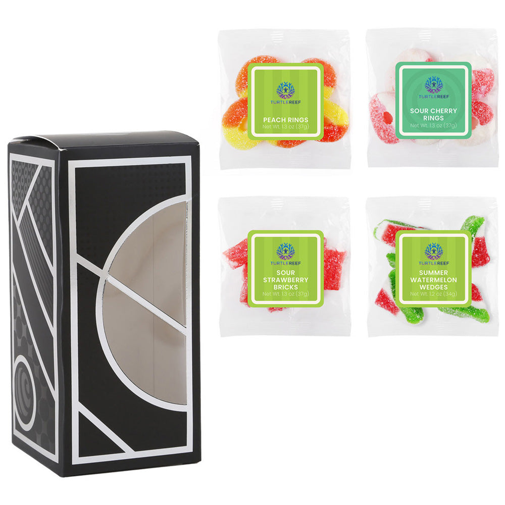 SugarSpot Black Fruit Cocktail Sweetie Box with a custom logo will make your dessert table colorful and flavorful. The sweet assortment is reminiscent of fresh fruit salad in a sleek box. Consider these for quinceaneras, parties, or corporate events as a gift or addition to the menu. Place an order right away before these sell out.The minimum order for this product is 25 pieces.